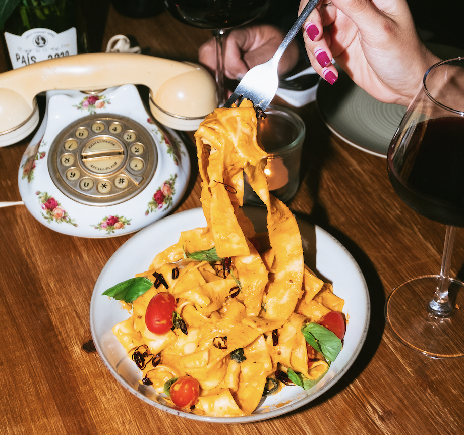 Hand-Cut Pappardelle, Rich, Slow-Cooked Creamy Tomato Sauce, Garlic, Sun-Dried Chili, Fresh Organic Basil From Our Own Farm